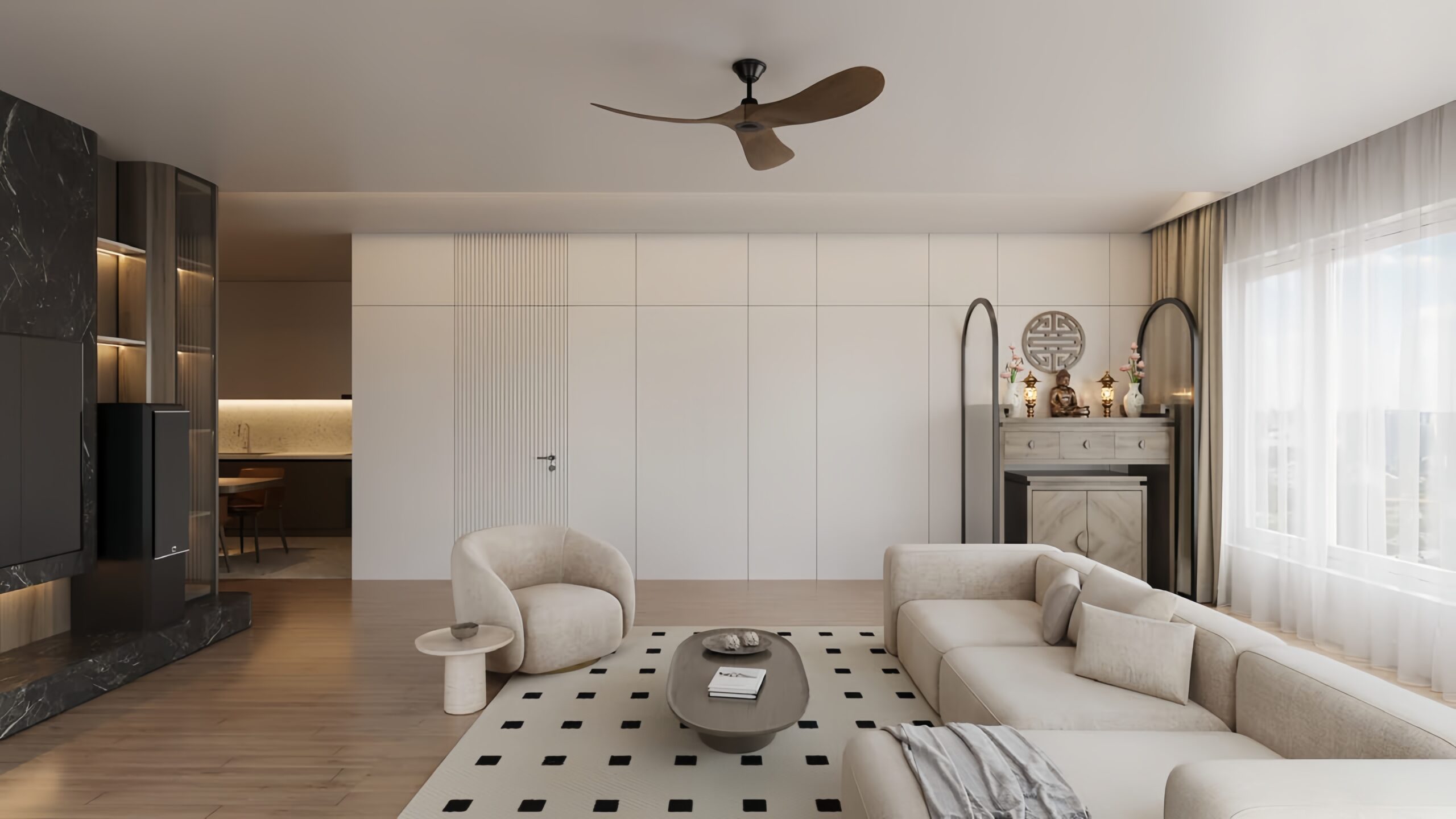 Khoảng cách hợp lý giữa các phòng giúp đảm bảo sự riêng tư, thông thoáng và tạo cảm giác hài hòa trong tổng thể. Có thể sử dụng vách kính mờ, rèm nhẹ hoặc tủ trang trí để ngăn cách khéo léo giữa các khu vực mà không làm không gian bị chia cắt.