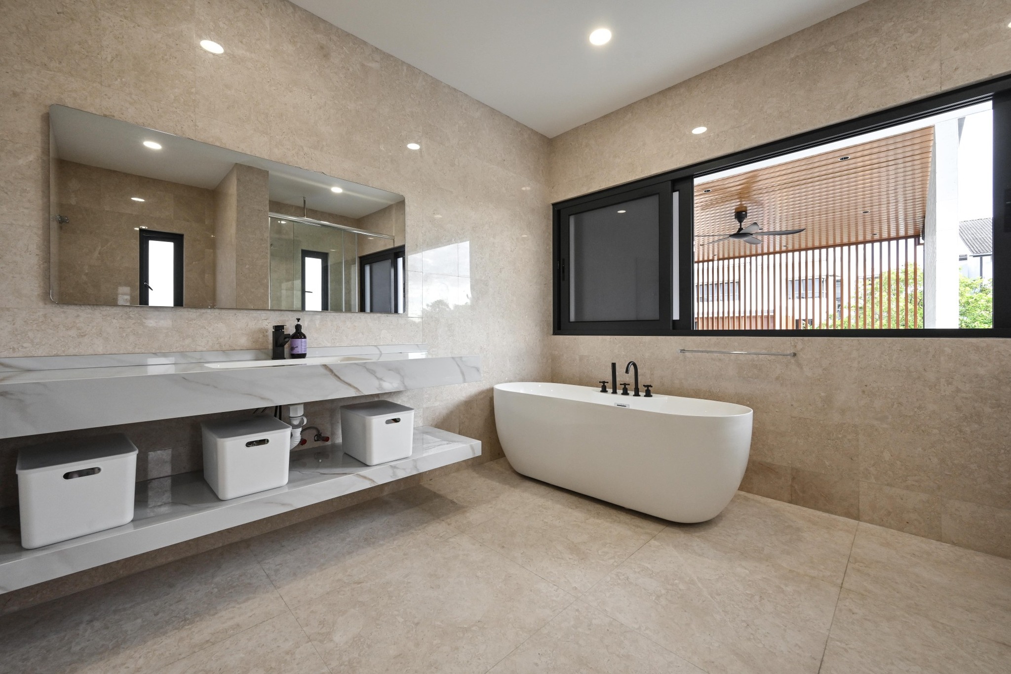 Không còn chỉ là nơi vệ sinh cá nhân, phòng tắm hiện đại là không gian thư giãn. Việc cải tạo bao gồm thay thiết bị, hệ thống chống thấm, ánh sáng và gương lớn để tạo cảm giác rộng rãi.