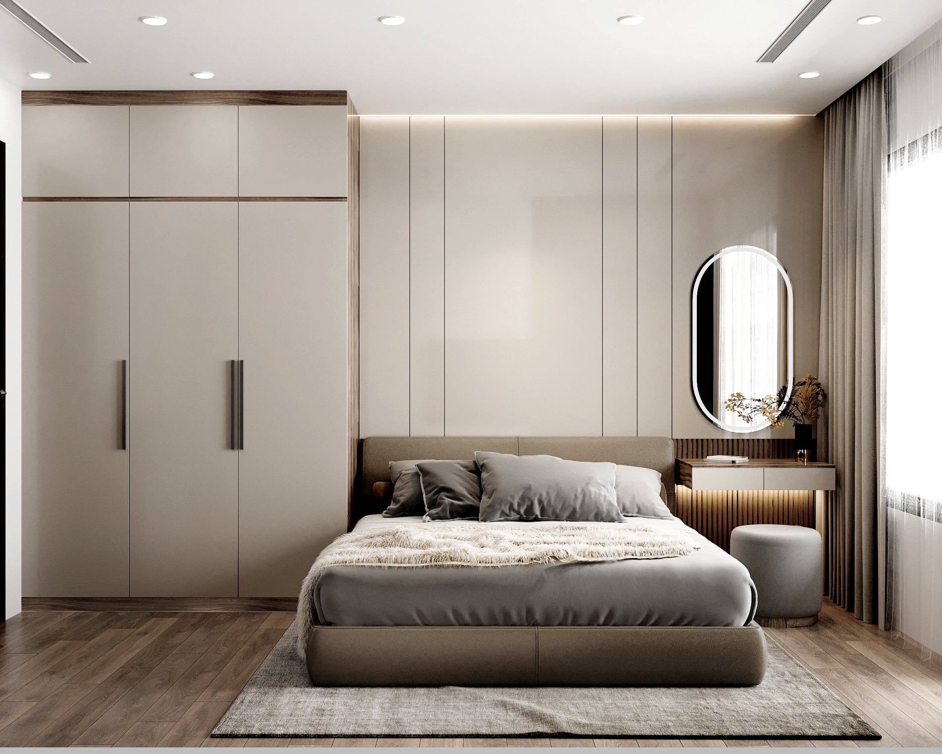Thiết kế cánh phẳng, ít chi tiết, ưu tiên cửa lùa cho phòng nhỏ. Có thể kết hợp đèn LED hắt nhẹ phía trên để tạo cảm giác sang trọng.