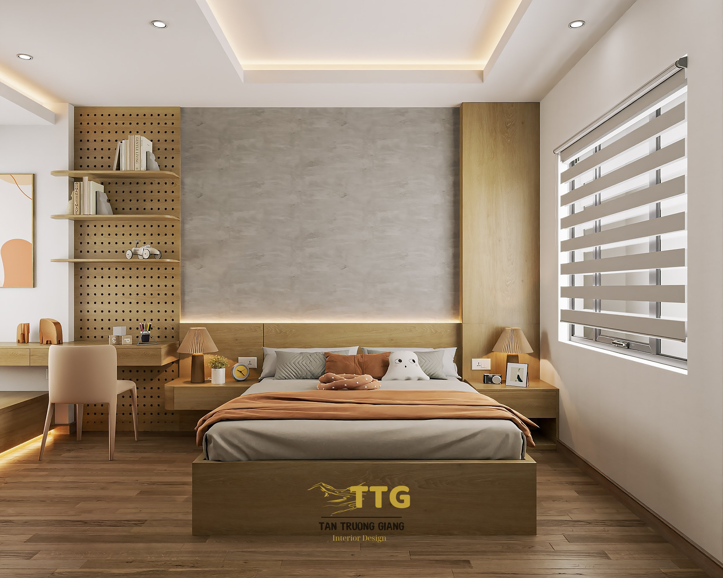 Điểm nhấn là vách ốp đầu giường và tấm lam sóng được bố trí hài hoà.