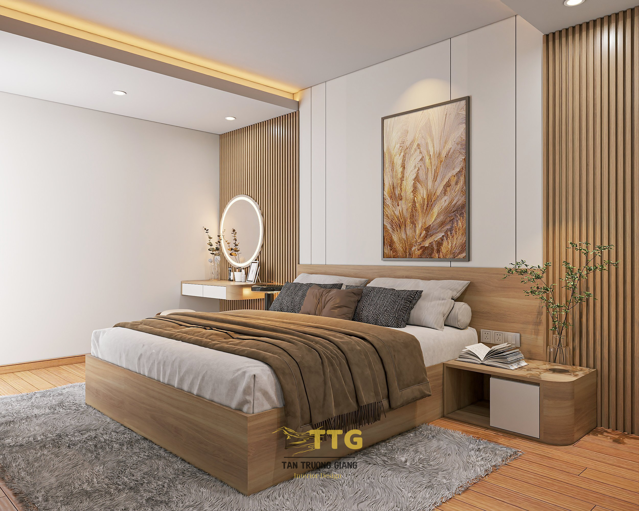 Phòng ngủ Master kết hợp giữa màu vân gỗ và màu trắng tạo sự hài hoà, ấm cúng tự nhiên.